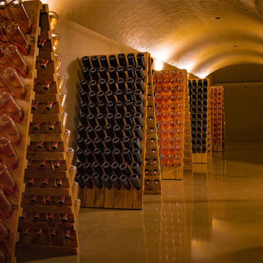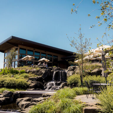 The modern tasting facility is nestled on the 40-acre biodynamically farmed Bernau Estate Vineyard site along Highway 99 near Dundee in the Dundee Hills AVA. The tasting bars include the main tasting bar plus the exclusive club tasting bar that supports the lower and upper club areas. Positioned just behind both tasting bars is a well-equipped restaurant kitchen plus a dedicated wine storage room capable of holding 240 cases of wine. Expansive windows provide breathtaking views. Through several doors, guests can venture out and explore the beautiful gardens and terraced patios. Guests can relax with a glass of wine while listening to the soothing sounds from the multi-level water feature, which has wood bridges and waterfalls that eventually flow into an 80,000-gallon fire retention pond. Below the main floor is an underground bottle aging cellar for their world-class méthode champenoise sparkling.