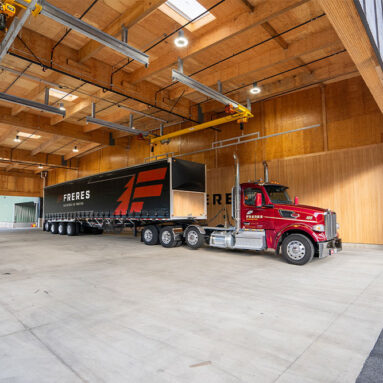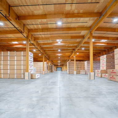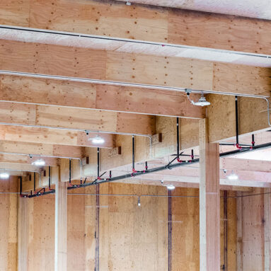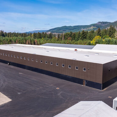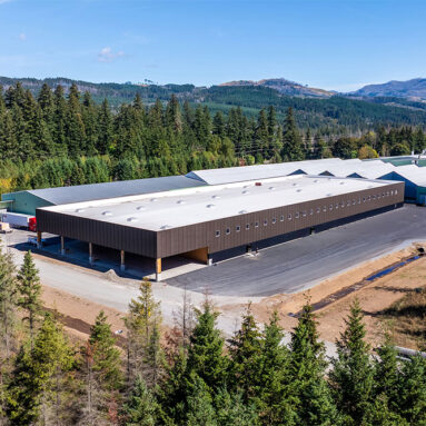 This building was entirely constructed using innovative veneer-based Mass Ply Panels and other Mass Ply Products from Freres Engineered Wood. From posts and beams to walls and roof components, everything was made of Mass Ply. Once the panels and components were manufactured, they were machined using CNC technology to a tolerance of within 1/16 inch. Components arrived by truck and the building was assembled starting with 4” wood tilt-up wall panels, followed by newly certified 1.9E grade beams, which offer performance comparable to glulam but are more cost-effective. No wood was cut on-site, making the speed of construction truly impressive.