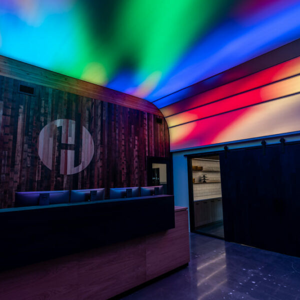 Nearly every office and room features a different light fixture, with the reception area featuring a fabric lined 16,000+ bulb LED light fixture capable of displaying thousands of combinations of colors and motion effects, including sky and floating cloud combinations to a spectacular multi-color light show.
