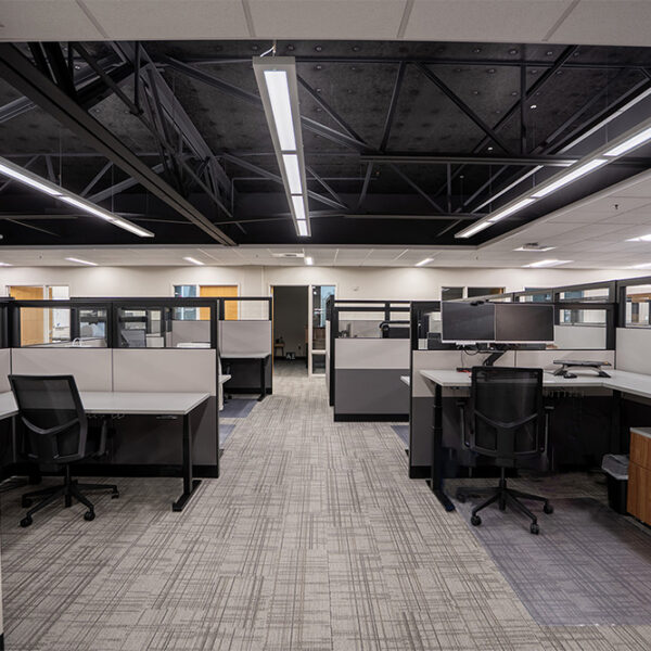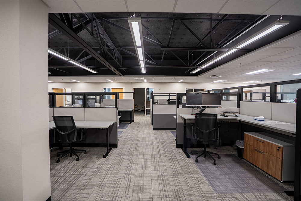 - Open ceiling concept above cubicle area with acoustic panels attached to structural deck above