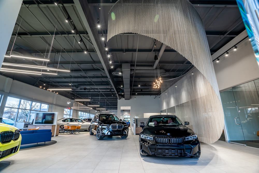 The BMW customer experience was elevated with the creation of focal areas in the showroom. These areas are emphasized by sleek LED lighting and custom rugs. The interior build-out included a reception, service reception, glass-walled offices, customer lounge, restrooms, and tile flooring throughout the service drive, service bays, and showroom.